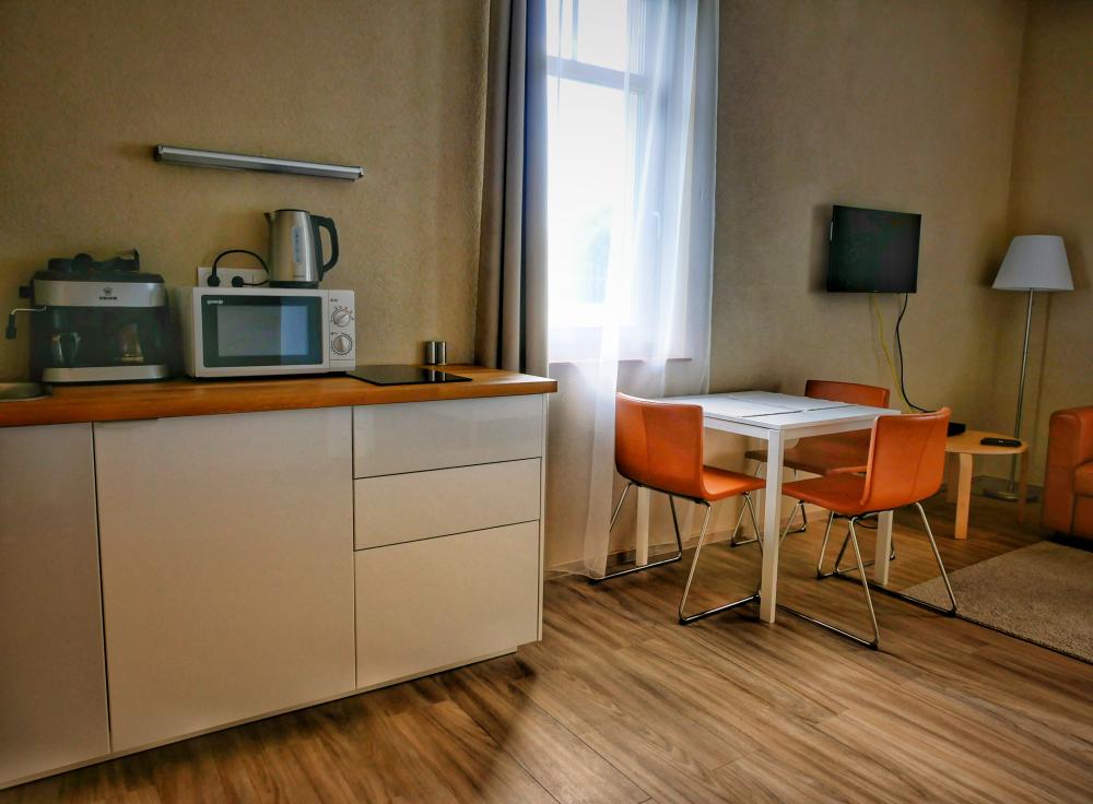 Négyzónás indukciós főzőlap, sütő, mosogató, hűtőszekrény, mikrohullámú sütő, kávé/teafőző, komplett evőeszköz és edény szett 16 fő részére, 4 db étkezőasztal és 16 db étkezőszék, TV és Telekom kábeltévé, wifi elérhetőség.